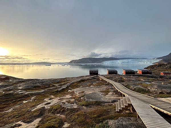 路程12km,晴天時大人腳程5小時內可完成,但是我們帶著雙寶6y和8y,加上遇到連tour guide都說是tornado 等級,無法站立要被吹跑的超強風勢,早上九點出發,下午快四點,花了近七小時才回到我們的入住小屋的瘋狂健行。前一晚的美麗落日時分,遺世獨立的廣闊大景。海面上的浮冰大多是從Eqi glacier 姐妹冰川來的,兩種不同類型延伸入海的冰川,Eqi glacier 崩塌速度較快,掉下來的冰塊較小,另一種冰川延伸至海(下方海水的),約兩週一次崩塌,但掉下來的冰塊大。眼前海面上的浮冰多來自Eqi glacier 的姐妹冰川。