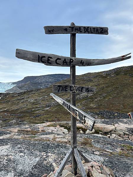 5km,約3小時路程,沿著海岸線前進,一邊就是往海的陡坡,一邊是山坡,沿路可以遠望Eqi glacier和不時聽到ice calving ,也能找到很多crowberry 的健行步道。Eqi glacier lodge 附設cafe旁的木製健行步道指標,上面的時間超短,參考用,不要真的相信。 從我們的10號小屋在落日時分往delta hike trail 方向看過去的景色。 出發前會先經過探險家的紀念墓碑,敬畏大自然的力量。 由於第一天下午抵達時有先跟大寶探勘過一小段路後因部分健行步道泥濘而折返,所以第三天早上全家出動就換上雨鞋了。兩寶非常高興在水坑裡踏水。不過記得雨鞋裡頭一定要穿上厚毛襪保暖以免低溫讓孩子腳受傷。 沿途的小花小草都很可愛,也不時聽到冰川崩裂轟隆隆的聲音。