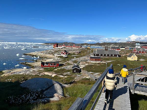 因為前一天格陵蘭航空班機延誤六小時的關係,第一天的行程報銷,只好把Ilulissat 紅黃藍三線健行縮成同一天,早上走了黃線,回到民宿吃午餐休息後又跑出來走藍線。出發前發現退潮,浮冰都漂在卡在岸邊,忍不住走近海邊冒險一番。剩餘的腳力只能走Ilulissat blue trail部分。從民宿附近找到往海岸邊的木棧道,朝浮冰出發! 退潮一陣子,發現海冰卡在岸邊,極圈暖陽溫柔的招喚再加上湛藍的天空,忍不住往海邊移動,偷摸一把浮冰。